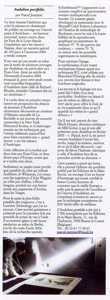 Voici un très bel exemple de bibliophilie contemporaine où les héritages culturels et les prouesses de la technologie moderne se complètent et s'enrichissent mutuellement. Ce portfolio, conçu par Pascal Jeanjean, papetier belge, réunit une selection de 40 aquarelles originales de Jean-Jacques Audubon, conservées a la New-York Historical Society, accompagnée de 8 dessins de l'enfance de l'artiste, decouverts récemment au Museum d'Histoire Naturelle de la Rochelle. Ces aquarelles originales ont servi a l'illustration, au XIX, siècle, de " Birds of America ", un ouvrage de 435 planches gravées et colorées représentant les oiseaux du continent américain grandeur nature.